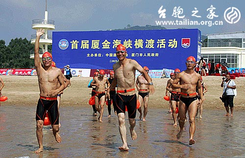 首屆廈金海峽橫渡活動于2009年8月15日上午舉行。廈門市市長市長劉賜貴在出發(fā)儀式上致詞說,廈門與臺灣一衣帶水,與金門相鄰而居,一灣淺淺的海峽象征兩岸血脈相連骨肉情深。首屆廈金海峽橫渡活動,跨越的不僅是海峽,更是象征著一個新時代的到來。金門縣縣長李炷烽在致詞中說,廈金橫渡活動的實現(xiàn),不僅僅是一場體育盛事和運動盛事,而且還將承載兩岸人民的民族感情,希望透過60年的沉淀,共同開啟輝煌的未來。