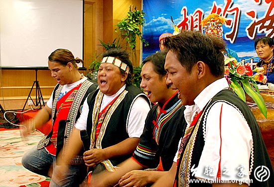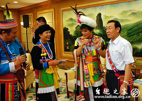 在2008年的首屆“豐收節(jié)”活動(dòng)中,福建省委常委唐國(guó)忠(右1)會(huì)見(jiàn)臺(tái)灣少數(shù)民族代表