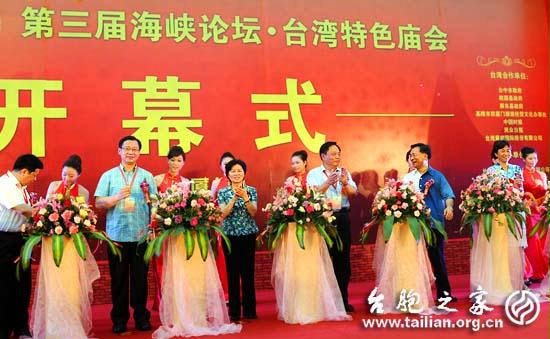 全國人大常委、全國臺聯(lián)會長梁國揚、福建省委常委、副省長陳樺出席開幕式,與臺灣嘉賓一道為臺灣特色廟會活動開幕剪彩。