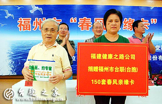 福建健康之路健康管理股份有限公司成立于2000年,經(jīng)過近10年的發(fā)展,已經(jīng)成為一家國內(nèi)領(lǐng)先的專業(yè)就診服務和健康管理公司,通過建立專業(yè)的服務平臺,整合強大的健康及醫(yī)療服務資源,為就診指導、健康咨詢提供一站式服務。這次捐贈活動提供1200張“親緣卡”,發(fā)放對象為在榕投資的臺商、常住大陸的臺胞、福州市勞模等。公司出資40萬元開展公益事業(yè),積極響應市委、市政府的“春風、春雨”行動,為建設海峽西岸經(jīng)濟區(qū)出一份力,為兩岸同胞服務。(福州市臺聯(lián) 陳蘇海)