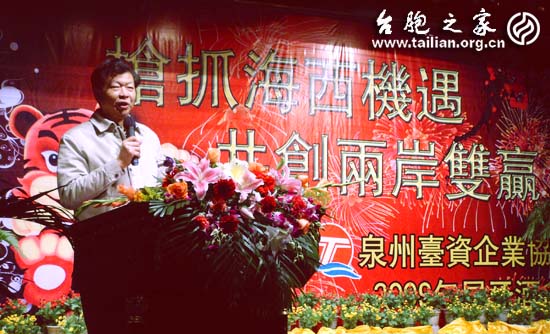陳榮洲副市長在臺商尾牙聯(lián)歡上致詞,他說,2009年泉州市國民經(jīng)濟和各項社會事業(yè)取得的喜人成績,這些成績的取得是與在座臺商的貢獻分不開的。他代表市政府感謝廣大臺商朋友長期以來為加強兩岸經(jīng)濟文化交流與合作所做出的積極貢獻,祝大家新年快樂,吉祥如意。他表示,在新的一年里,泉州市將繼續(xù)依法保護臺商的合法權(quán)益,努力為臺商朋友排憂解難,一如既往地歡迎臺灣同胞來泉開展經(jīng)貿(mào)活動,堅持執(zhí)行鼓勵臺商投資的政策,積極促進泉臺兩地經(jīng)濟進一步發(fā)展。