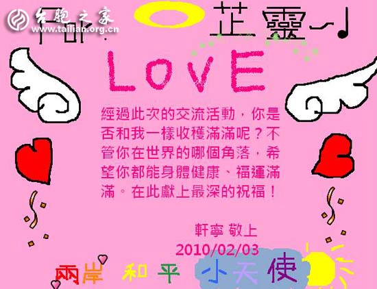 臺(tái)灣!美麗的寶島臺(tái)灣!希望我很快能與你再次相見。愿到時(shí)候我們所有兩岸和平小天使手拉手、心連心,共創(chuàng)和平的未來! (福州市 毛芷靈)