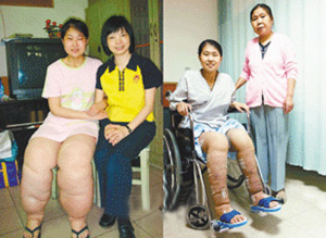 24歲的徐州女孩王程患上罕見的慢性下肢淋巴水腫,僅雙腿就重達50公斤(本報6月14日曾做報道)。經(jīng)過在臺灣兩個多月的免費手術(shù)治療,昨天她在臺北萬芳醫(yī)院淋巴治療中心首度露面,展現(xiàn)其“瘦腿成果”。經(jīng)過腹大網(wǎng)膜移植手術(shù),王程的雙腿復原情況良好,大腿圍從術(shù)前的66厘米縮至45厘米,就連體重也從82公斤減至63公斤。目前王程已獲得75萬元的善款,再住院兩周至一個月可望康復出院。