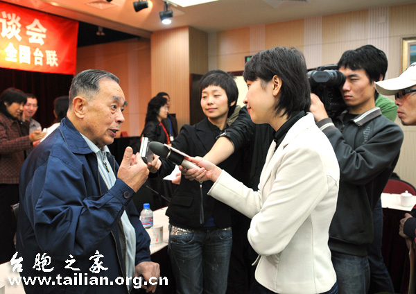 當(dāng)年參加過抗日戰(zhàn)爭的老臺胞何標(biāo)在座談會上接受媒體記者的采訪。(徐波/攝影)