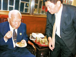 顏清標(biāo)前天獲悉張克輝思念臺灣肉粽,當(dāng)晚就請家人備料,昨天起大清早,親自替張克輝準(zhǔn)備五花肉、香菇、冬蝦和蘿卜干等材料包裹的傳統(tǒng)家鄉(xiāng)味肉粽,在張向媽祖上香后,拿出來讓他品嘗,張吃得滿口留香,頻頻說好吃。