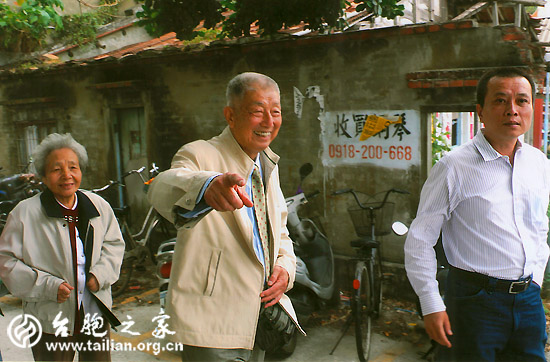 蔡騰芳的孫子蔡振德(右)帶領(lǐng)薛秋帆(中)夫婦觀看當(dāng)年躲難的住處。