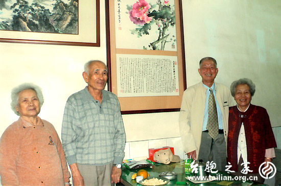 薛秋帆夫婦(右)與蔡騰芳夫婦(左)在薛秋帆贈(zèng)送的牡丹畫前留影。