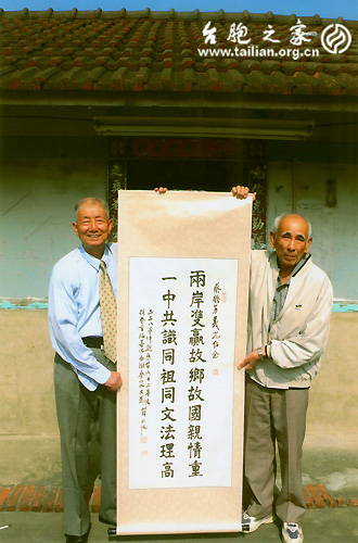 17日上午到善化時(shí),在時(shí)隔六十二年后,我與蔡騰芳相見(jiàn)擁抱那一刻,激動(dòng)得淚珠奪眶而出。雙方親人會(huì)見(jiàn)后,參觀了他們的祖居和我當(dāng)年躲難的住處,我百感交集。我和蔡騰芳手捧蔡老先生夫婦的遺像照相后,我贈(zèng)送帶去的禮品。我贈(zèng)送騰芳的書法軸上寫的:“兩岸雙贏故鄉(xiāng)故國(guó)親情重,一中共識(shí)同祖同文法理高”。接著,到善化火車站月臺(tái),看一看我當(dāng)年跳下火車的地方。我兒子薛葆說(shuō):爸爸過(guò)去曾說(shuō)過(guò),在“二.二八”時(shí)遭遇危險(xiǎn)跳下火車,印象并不深刻。今天實(shí)地參觀,方知當(dāng)年要不是蔡老先生營(yíng)救,那后果真不堪設(shè)想。 接著,蔡振德帶我們到善化鎮(zhèn)公所。鎮(zhèn)長(zhǎng)李文俊,鎮(zhèn)民代表會(huì)主席李立先和鎮(zhèn)公所秘書等人會(huì)見(jiàn)我們。在茶敘時(shí),李鎮(zhèn)長(zhǎng)說(shuō):前年國(guó)民黨臺(tái)南縣主委蘇明國(guó)接到你尋找蔡家后代的信息,很受感動(dòng)。他把尋找的事交代我辦理。我也認(rèn)為,你真是一位有情有義的人。事隔六十年后,還會(huì)記得感恩。我一定要幫你找到的。他還說(shuō),我們臺(tái)南人的祖先,大部分是從福建的福州、泉州、漳州三府開家來(lái)。他的祖先是從漳州府開來(lái),到他這一代是第十代了。我接著說(shuō),蔡全能老先生當(dāng)年對(duì)我說(shuō)過(guò),他的祖先從泉州府開來(lái),到他那一代是第五代,這樣算起來(lái),蔡騰芳是第六代,他下面有三代,那也是第九代了,李鎮(zhèn)長(zhǎng)的祖先比蔡家的祖先先進(jìn)啊!蔡家祖先比你家的祖先來(lái)臺(tái)落后有幾十年吧!我說(shuō)后引得大家一陣笑。我送給蔡家后代的書法軸有一幅寫:“閩臺(tái)一脈同宗祖,海峽兩岸共血緣”,正是海峽兩岸親人現(xiàn)實(shí)生活的反映。