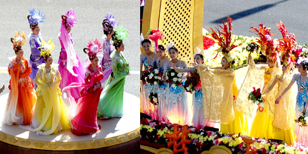 美女總是受到青睞的。左圖為安徽彩車上的七仙女,右圖為湖北彩車上的一位美女正伸出雙手迎接路邊行進(jìn)中群眾拋來的鮮花。 徐波 攝影