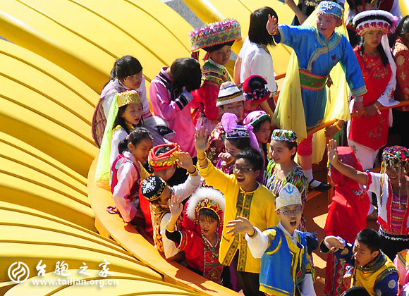 在民族團(tuán)結(jié)彩車的葵花中,身穿臺灣少數(shù)民族之一阿美族服飾的少女正與其他民族的青年向路邊的群眾揮手致意。 徐波 攝影
