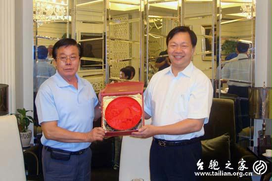 全國臺聯(lián)聯(lián)絡部何長明部長(右)看望臺灣客人并相互交換禮物 周雄銘/攝影