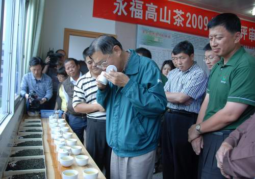 5月10日,在等待應(yīng)邀前來參訪的天福總裁李瑞河時,在漳平臺商聯(lián)誼會里除了早已到此的市領(lǐng)導(dǎo)及臺商外,在創(chuàng)業(yè)園里投資的臺農(nóng)們精選出今年春茶的43個茶樣,一字排開,“恭候茶人的評鑒”。永福高山茶2009年春茶評審會在此隆重舉行。