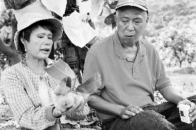 何文淵夫婦倆席地而坐,探討蓮霧的色澤和質(zhì)量。圖片來(lái)源:福建日?qǐng)?bào)