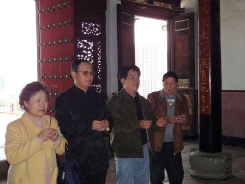 在廖長官紀念館(供奉五代開墾安溪的長官廖儼),廖先生一行焚香,向堂上廖長官尊像行禮參拜。廖正豪先生祖籍安溪,在臺灣已傳至第十四代了。隨后廖先生與安溪宗親暢談廖氏淵源,了解介紹安溪廖氏先祖的豐功偉業(yè)和到臺的情況。 在家鄉(xiāng)期間,廖先生還參觀了在清水巖,他一邊聽導游講解,一邊與陪同人員交談在臺清水祖師分爐的情況,參拜了清水祖師,并當場捐獻香火款。