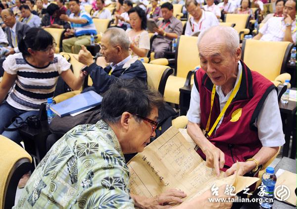 兩岸王氏宗親代表在會(huì)場(chǎng)間隙對(duì)接“開(kāi)閩王氏大總譜”。徐波/攝影