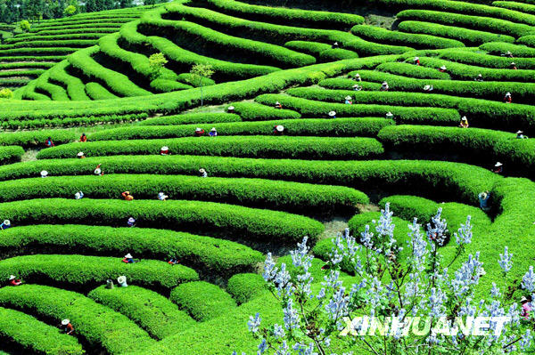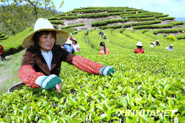 4月24日,茶農(nóng)在福州閩侯縣文武雪峰農(nóng)場(chǎng)茶園采摘春茶。新華社記者張國(guó)俊攝