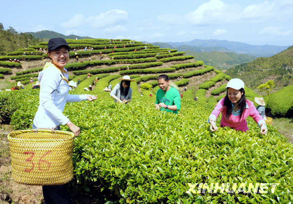 4月24日,臺(tái)灣游客(左一)在福州閩侯縣文武雪峰農(nóng)場(chǎng)茶園采摘春茶。新華社記者張國(guó)俊攝