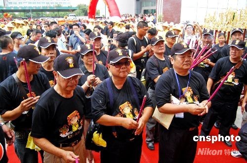 九月五日中午,臺(tái)灣鹿港天后宮進(jìn)香團(tuán)的三百多名媽祖信眾由金門分兩批乘船抵達(dá)泉州石井對(duì)臺(tái)客運(yùn)碼頭,進(jìn)行為期五天的謁祖進(jìn)香活動(dòng)。 這是鹿港天后宮開基媽祖一百九十一年后重回大陸謁祖。據(jù)介紹,鹿港天后宮媽祖,是三百多年前施瑯將軍從福建引請(qǐng)到臺(tái)灣的。曾于清嘉慶二十二年(一八一七年)在鹿港八郊人士護(hù)送回湄洲祖廟謁祖,迄今已一百九十一年,這次再回祖廟會(huì)香,見證兩岸媽祖神緣。圖為鹿港進(jìn)香團(tuán)在石井碼頭舉行祭拜儀式。 中新社發(fā) 傅丹丹 攝