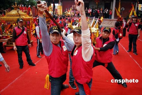 2月15日,臺灣嘉義市天后宮600多名首度直航抵達(dá)大陸謁祖進(jìn)香的信眾來到福建泉州,從府文廟廣場出發(fā)沿著中山路走向南門天后宮,隊伍格外浩蕩。圖為臺灣嘉義媽祖在進(jìn)入天后宮前的“參拜”儀式。 中新社發(fā) 傅丹丹 攝
