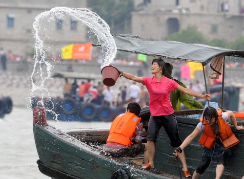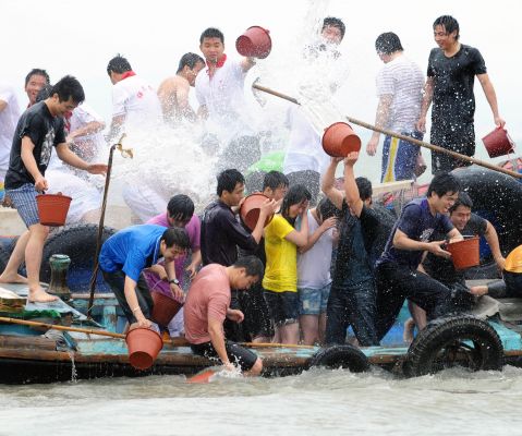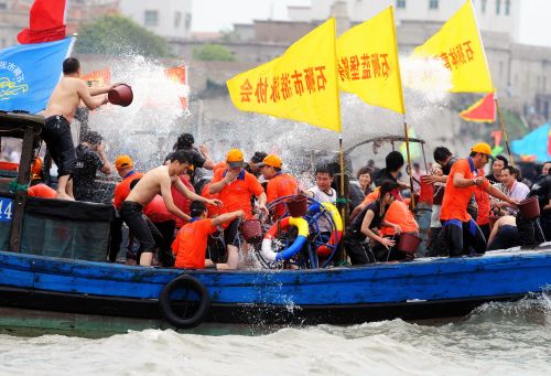 “清涼的海水潑過船去,美好的祝福帶給對方”。蚶江漁民蔡榮勝告訴記者,“端午節(jié)的海水是吉祥之水,潑到就是福氣!”