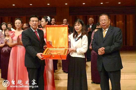 福建省臺(tái)聯(lián)柯連妹副會(huì)長(zhǎng)(右)與臺(tái)灣領(lǐng)隊(duì)盧孝治先生互贈(zèng)紀(jì)念品 鄭嵐/攝影