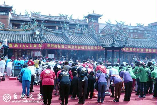 來自臺(tái)灣中華的一千余名中華道教關(guān)圣帝君弘道協(xié)會(huì)會(huì)員及臺(tái)灣、香港、馬來西亞、新加坡、菲律賓、印尼等地的關(guān)帝廟宇信徒身著印有“泉州通淮關(guān)岳廟,臺(tái)灣開基第一廟”字樣的文化衫或各廟宇的專用馬甲,齊聚泉州參加“第二屆泉州海峽兩岸關(guān)帝文化節(jié)”開幕式和“紀(jì)念關(guān)帝1852周年誕辰祭祀大典”。據(jù)了解,此次祭祀大典是依據(jù)通淮關(guān)岳廟志、參照臺(tái)灣關(guān)帝廟宇祭典儀式重新制訂的“新版祭典”,別有意義。