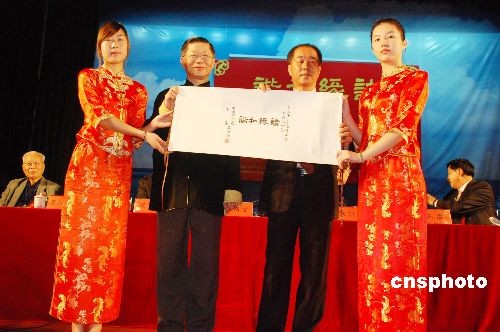 4月13日,第二屆海峽兩岸和諧文化節(jié)在福建泉州華光攝影學(xué)院開幕,活動(dòng)通過兩岸藝術(shù)文獻(xiàn)的匯集展覽和兩岸文化藝術(shù)界人士的雅集聯(lián)誼,共同抒寫兩岸和諧文化交流的新篇章。圖為臺(tái)灣兩岸和諧文化交流協(xié)進(jìn)會(huì)會(huì)長(zhǎng)陸炳文向華光攝影學(xué)院贈(zèng)送了中國(guó)國(guó)民黨主席吳伯雄題寫的“諸事和諧”賀詞。 中新社發(fā) 黃瑤瑛 攝
