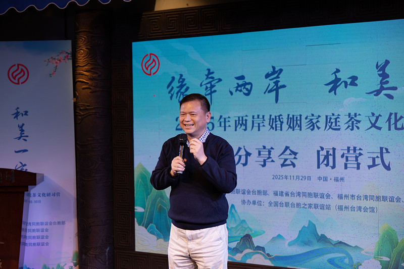 閉營(yíng)式上,全國(guó)臺(tái)聯(lián)臺(tái)胞事務(wù)部副部長(zhǎng)陳湛表示,兩岸婚姻家庭是祖國(guó)大陸高質(zhì)量發(fā)展的參與者和見證者,“十五五”時(shí)期包括兩岸婚姻家庭在內(nèi)的臺(tái)灣同胞將迎來新的發(fā)展機(jī)遇。本次活動(dòng)為各位營(yíng)員搭建起茶文化研學(xué)、茶產(chǎn)業(yè)交流的平臺(tái),希望大家繼續(xù)發(fā)揮兩岸橋梁紐帶作用,帶上島內(nèi)親友?;丶铱纯矗餐瑐鞒兄腥A優(yōu)秀傳統(tǒng)文化,共享中國(guó)式現(xiàn)代化發(fā)展機(jī)遇。臺(tái)青代表還分享了各自在閩就業(yè)創(chuàng)業(yè)的故事,交流了助力兩岸融合發(fā)展的感悟,引起了營(yíng)員們的強(qiáng)烈共鳴。